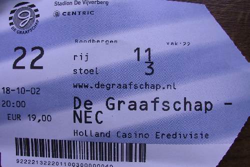 Wir steuerten unterdessen unser Hotel in der Innenstadt an, das den treffenden Namen "De Graafschap" trug. Die verbleibenden vier Stunden bis zum Anpfiff erlaubten uns noch einen kurzen Stadtrundgang, den der lästige Nieselregen allerdings etwas vermieste. In einem 40000-Einwohner-Städtchen gibt es natürlich nicht allzu viel zu sehen, aber nett war es dennoch. Vor dem Café unseres Hotels bei der Catharinakirche versammelten sich bereits die NEC-Hools und stimmten ihre Lieder an. Besonders bange musste einem dabei aber nicht sein, denn das Aggressionspotenzial hielt sich in Grenzen. Wir beschlossen schließlich, die 3 km zum Stadion zu Fuß zu gehen, um die Atmosphäre besser auf uns einwirken zu lassen. NEC ist eindeutig besser in die Saison gestartet, während De Graafschap mit nur einem Sieg aus sieben Spielen auf dem drittletzten Tabellenrang herumkrebst. Die Stimmung um das Stadion herum war extrem ruhig. Friedlich schlenderten die Zuschauer in Richtung "Vijverberg", während uns die schönen Einfamilienhäuser mit den puritanisch